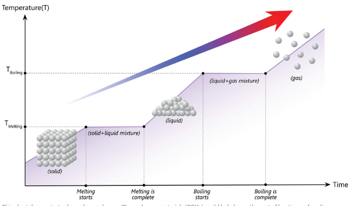 To understand how PCMs work, first, it’s important to remember that matter can be in various “phases” such as solid, liquid or gas. When something is changing phase, its temperature stays the same.